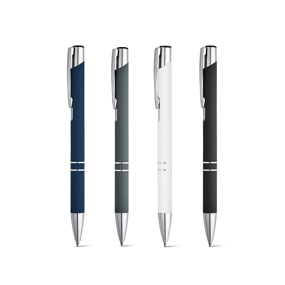 Caneta esferográfica em alumínio com acabamento emborrachado, clipe metálico e escrita em tinta preta.