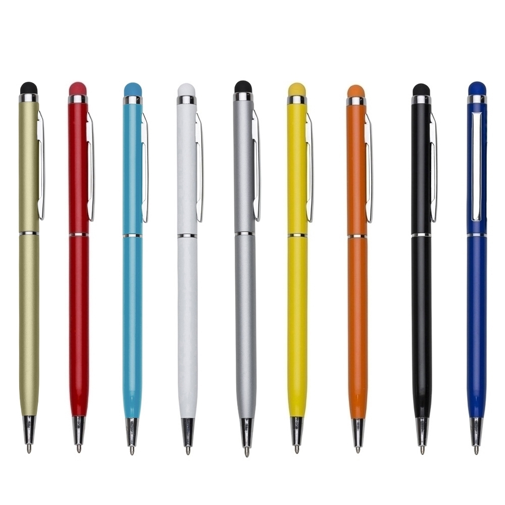 Caneta metálica com touch screen, carga esferográfica azul e acionamento por rotação.
