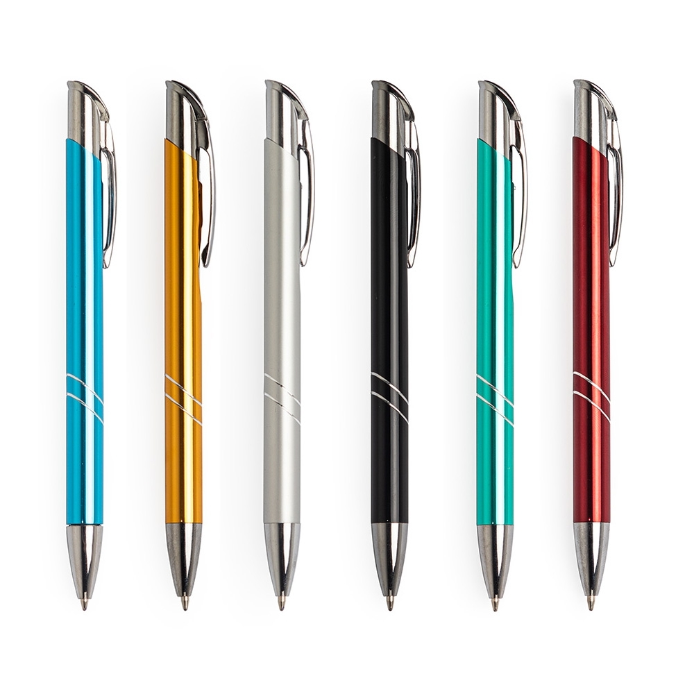 Caneta metálica com carga esferográfica azul e acionamento por clique.