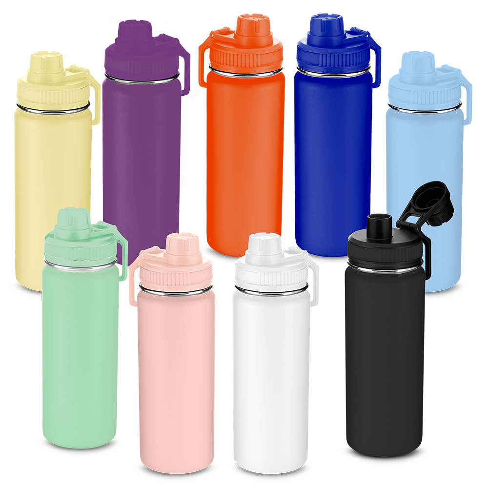 Garrafa térmica em aço inox com parede dupla com capacidade de até 570 ml. Tampa rosqueável, mosquetão em plástico e anel de silicone para vedação.