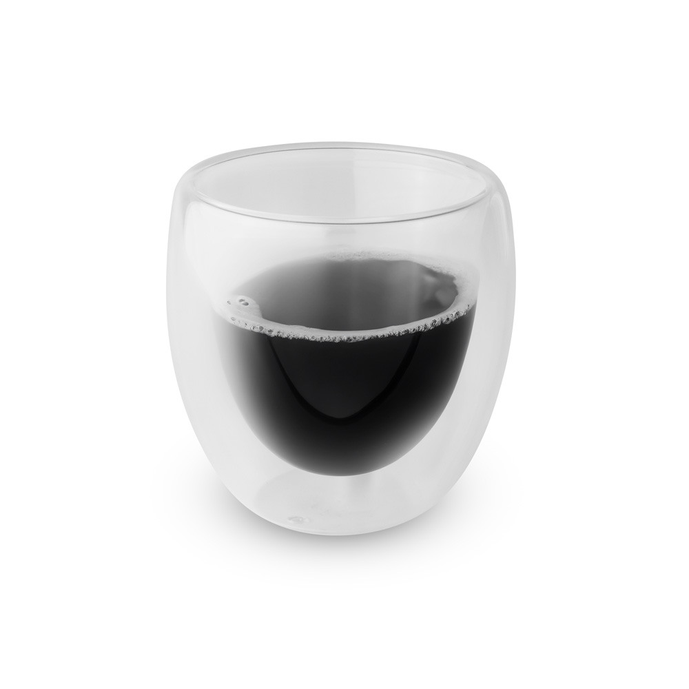 Conjunto com 2 copos de vidro borossilicato com parede dupla e capacidade de até 180ml.